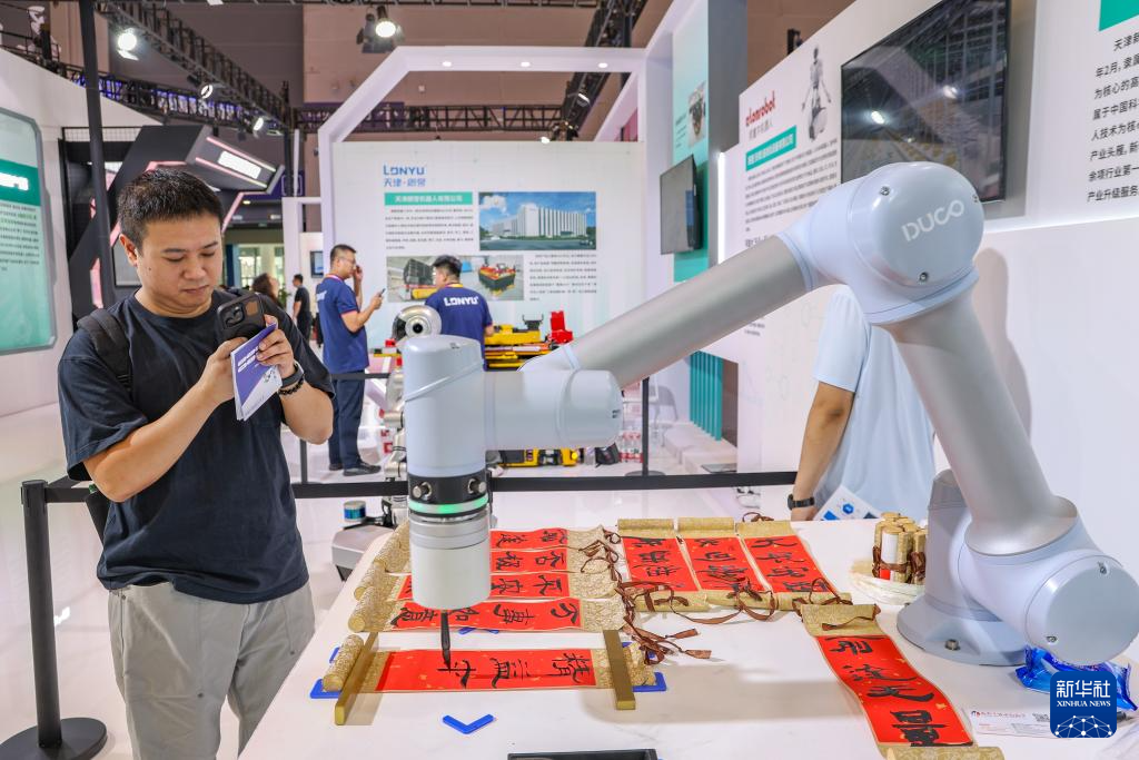 9月5日,观众在2025世界智能产业博览会上观看智能机器人书写毛笔字。