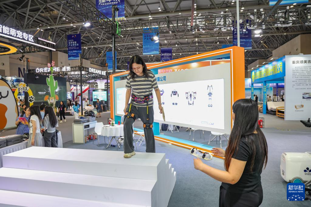 9月5日,观众在2025世界智能产业博览会上体验外骨骼机器人。