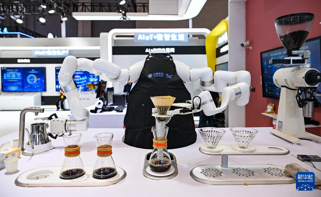 这是9月5日在2025世界智能产业博览会中国移动展厅拍摄的“咖啡机器人”。