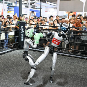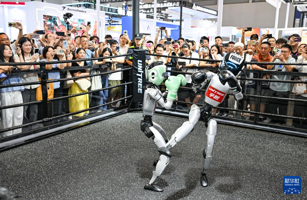 这是9月5日在2025世界智能产业博览会宇树科技展厅拍摄的机器人拳击赛现场。