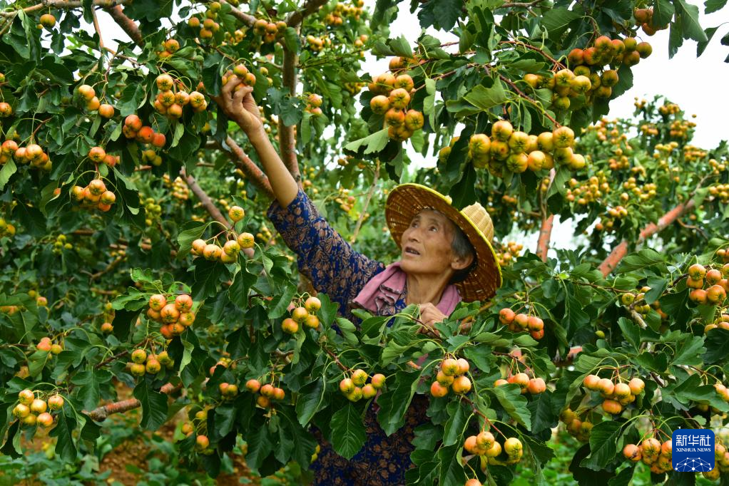 9月5日,山东省枣庄市山亭区水泉镇板上村农民在果园采摘山楂。