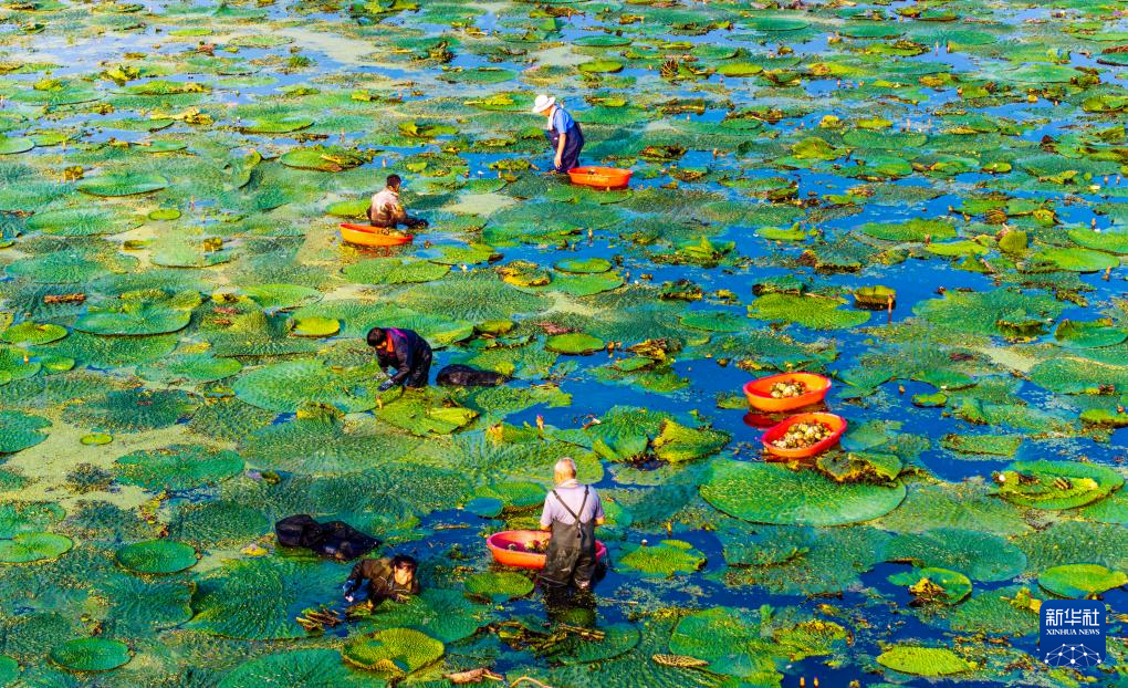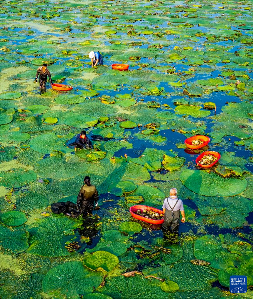 9月6日,农民在江苏省泰州市姜堰区顾高镇申俞村采收芡实(无人机照片)。