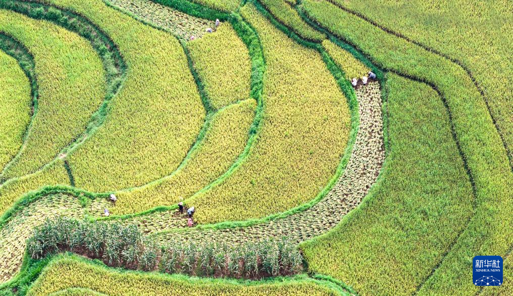 9月6日,村民在云南省文山壮族苗族自治州薄竹镇莫哈纪村稻田里收割水稻(无人机照片)。