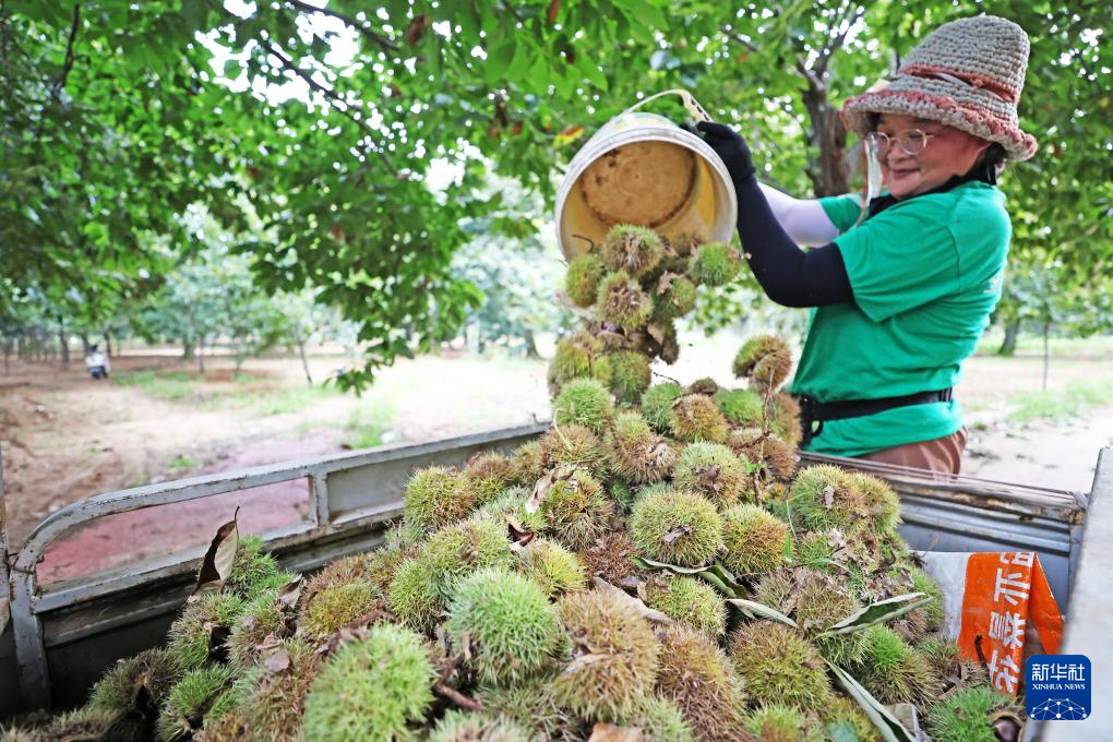 9月5日,山东省临沂市郯城县郯城街道农民装运收获的板栗。