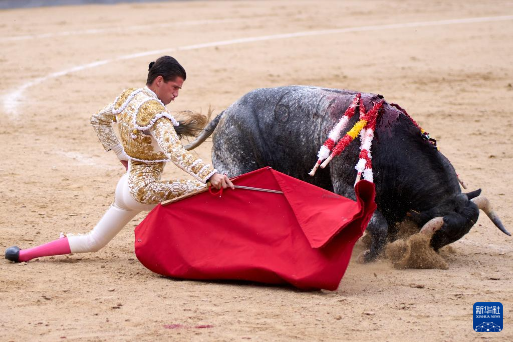 9月7日,一名斗牛士在西班牙马德里拉斯本塔斯斗牛场内进行斗牛表演。