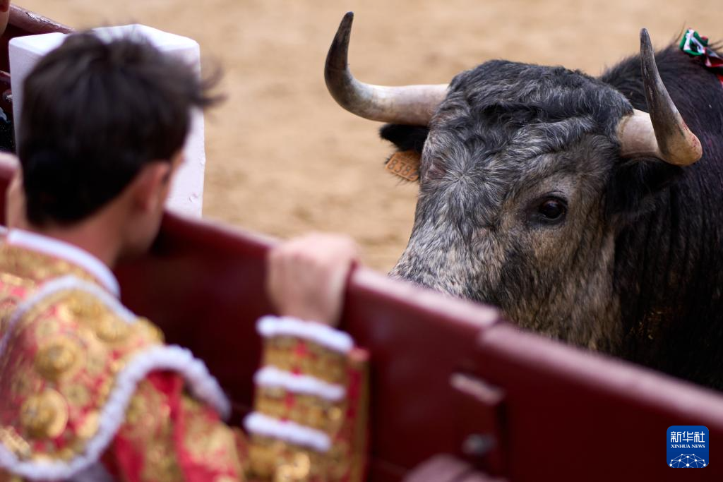 9月7日,一名斗牛士在西班牙马德里拉斯本塔斯斗牛场内的斗牛表演中与公牛对视。