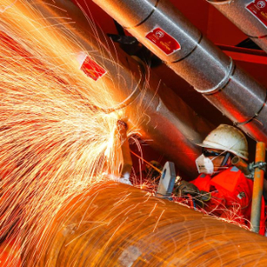 9月8日,工人在垦利6-1油田10-1北区块Ⅱ期开发项目油气平台安装作业现场进行切割作业。