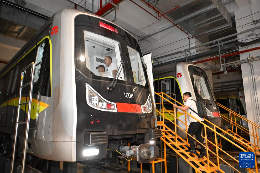 在天津地铁10号线梨园头车辆段,来自哈萨克斯坦的学员达尔罕夜间登上地铁列车准备上线考试(9月5日摄)。
