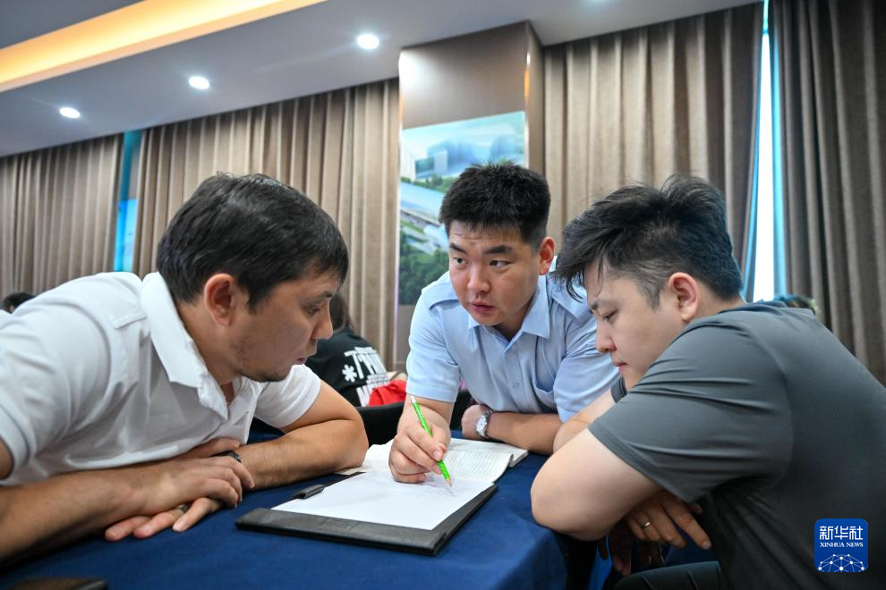 天津轨道交通集团培训教师张垚(中)在培训期间通过翻译为哈萨克斯坦学员答疑(7月14日摄)。
