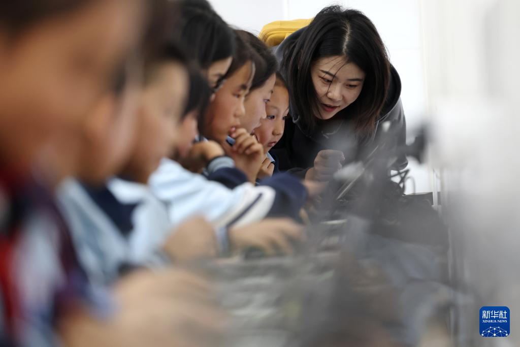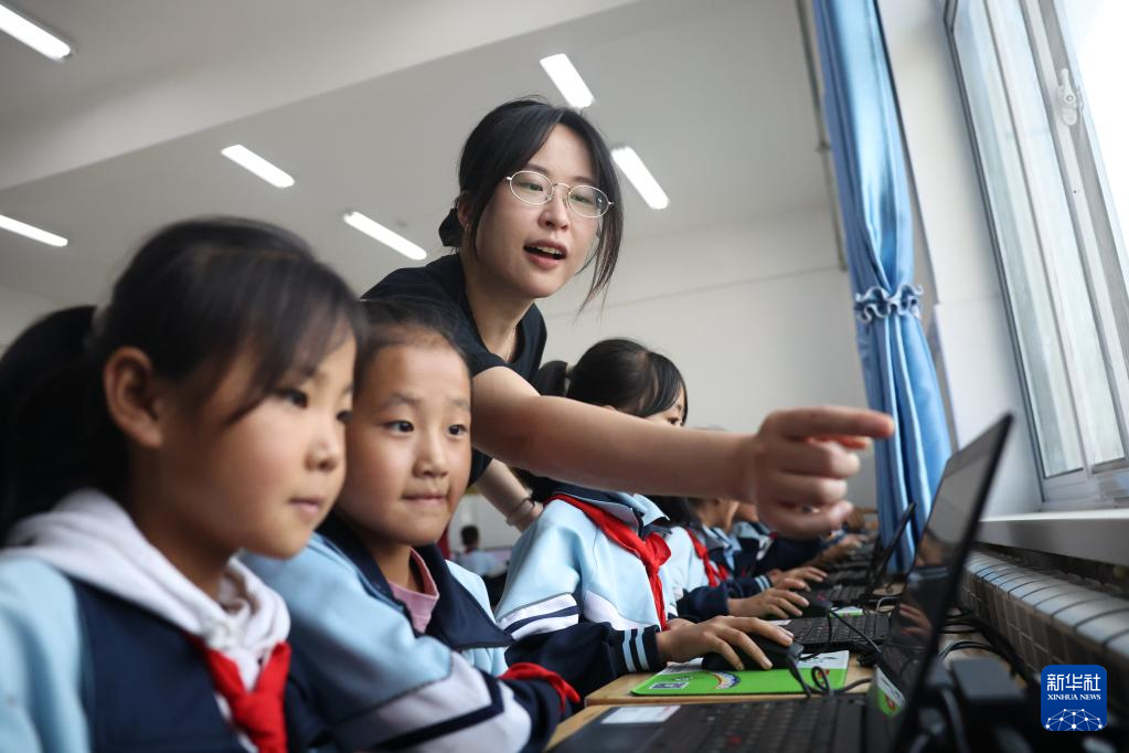 9月10日,参加活动的志愿者黎双(右一)在盐川学校再生电脑教室里给孩子们讲解AI知识。