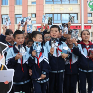 9月10日,盐川学校的孩子们手拿自己理想中的未来职业AI照片合影。