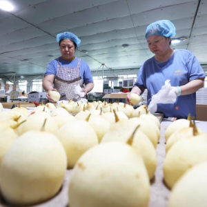 9月11日,河北省晋州市一家梨果出口企业的工人将梨果装箱。