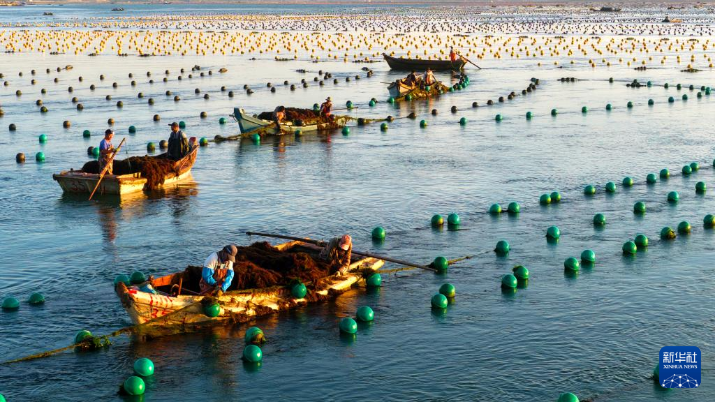 9月11日,在山东省荣成市爱伦湾海洋牧场,渔民驾驶渔船从事海上生产(无人机照片)。
