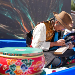 9月12日,在第四届藏香文化旅游节开幕式现场,木雕艺人展示尼木木雕工艺。