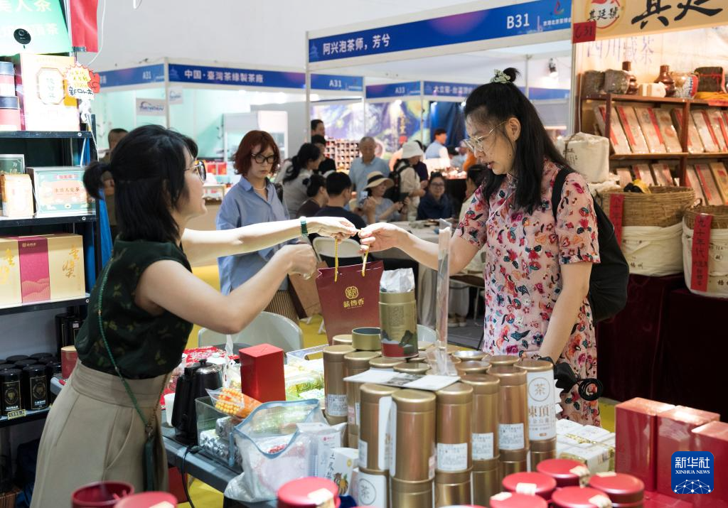 9月12日,在2025北京国际茶业及茶艺博览会(秋季)上,参观者在薪传香展台购买冻顶乌龙茶。