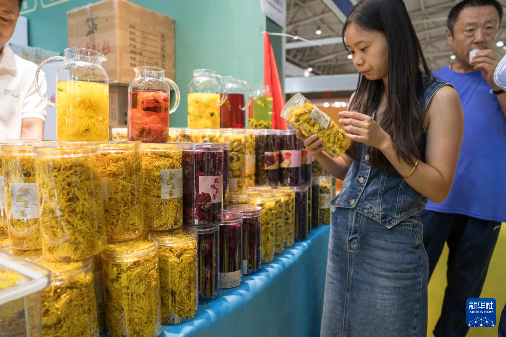 9月12日,在2025北京国际茶业及茶艺博览会(秋季)上,参观者在黄山茗茶展台挑选金丝皇菊。