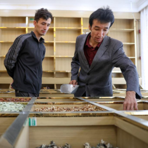 在位于新疆策勒县城即将开业的新药茶店内,买提卡斯木·芒里克(右)和外甥一起查看药茶原料(9月6日摄)。