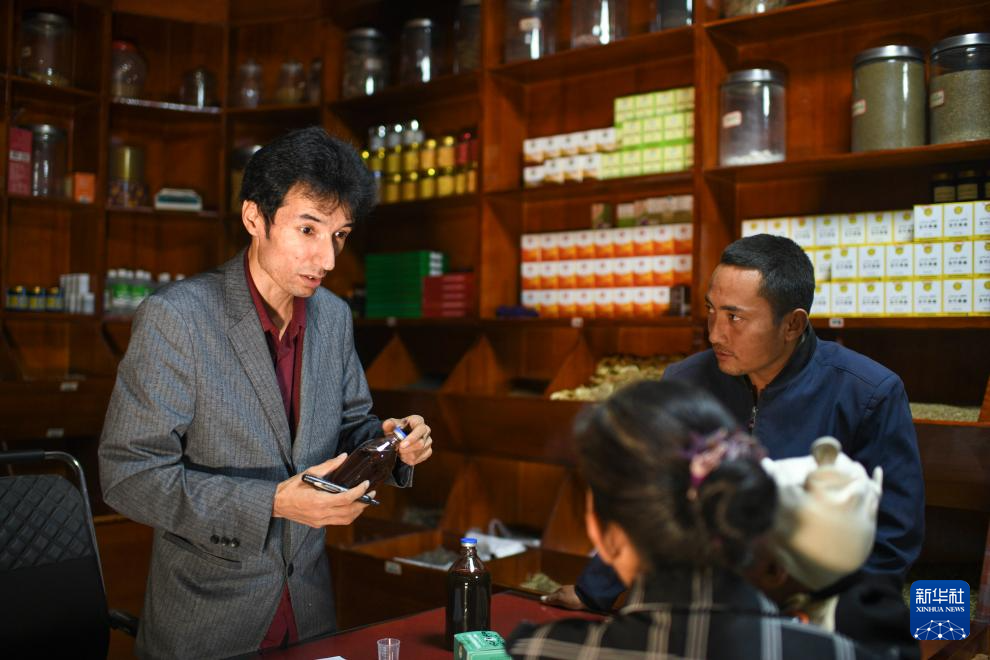 在位于新疆策勒县城的药茶店内,买提卡斯木·芒里克(中)在接待客人(9月4日摄)。