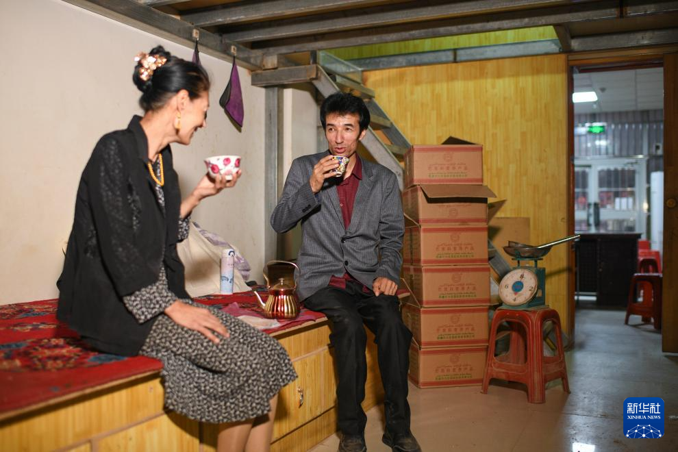 在位于新疆策勒县城的药茶店内,买提卡斯木·芒里克(右)和姐姐喝茶聊天(9月6日摄)。