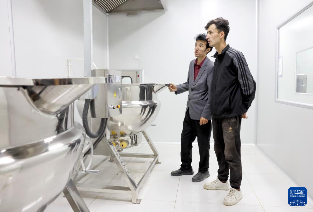 在位于新疆策勒县城即将开业的药厂内,买提卡斯木·芒里克(左)和外甥一起查看设备(9月6日摄)。