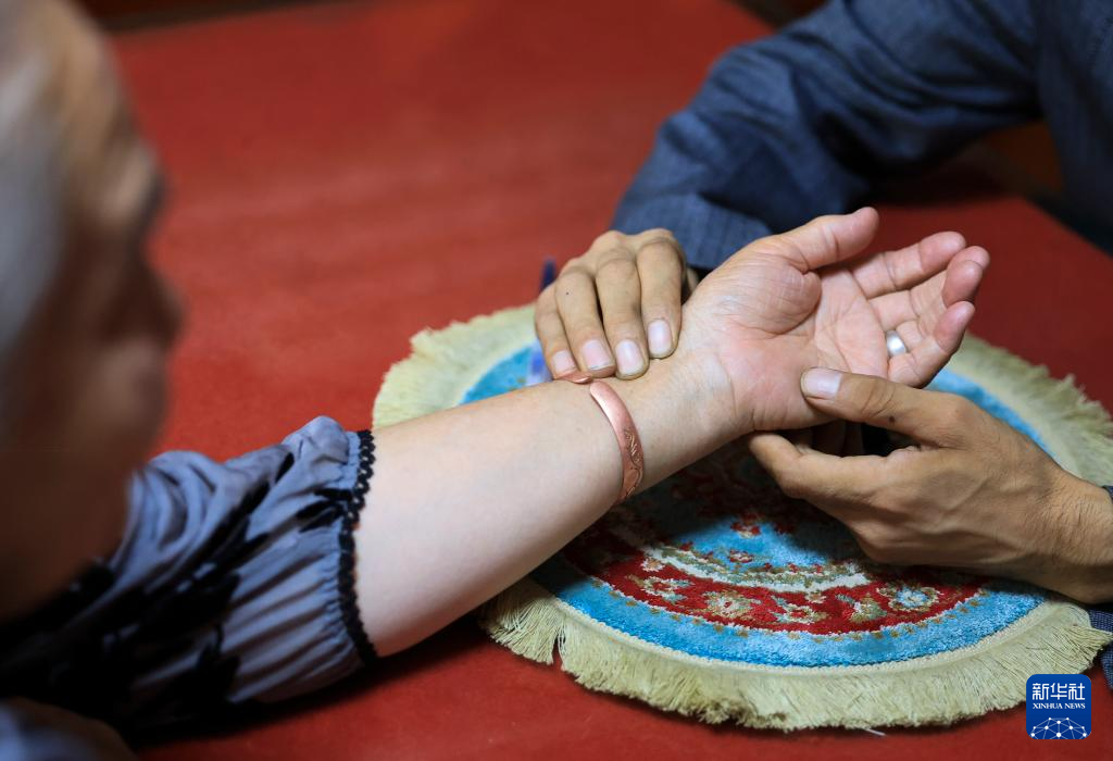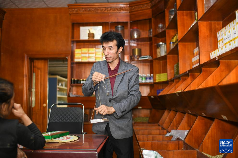 在位于新疆策勒县城的药茶店内,买提卡斯木·芒里克为客人把脉,准备配制药茶(9月4日摄)。