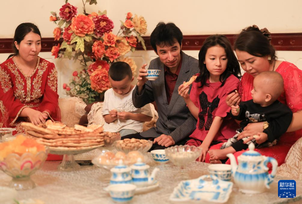 在位于新疆策勒县城的家中,买提卡斯木·芒里克(左三)和家人一起吃饭喝茶(9月5日摄)。