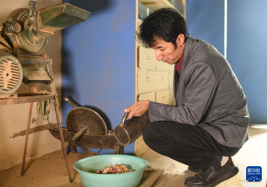 在位于新疆策勒县城的药茶店内,买提卡斯木·芒里克将磨碎的药材倒出,准备打包给顾客(9月5日摄)。