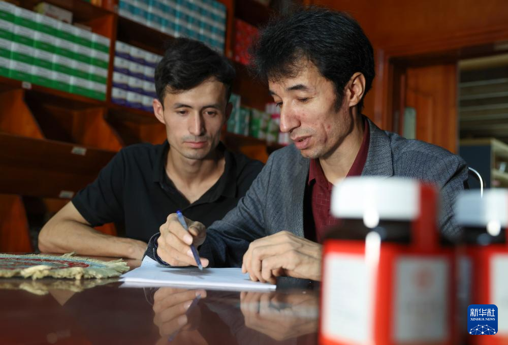 在位于新疆策勒县城的药茶店内,买提卡斯木·芒里克为客人把脉,姐姐在一旁帮忙(9月6日摄)。