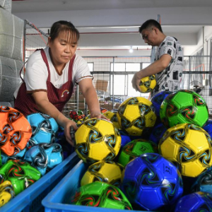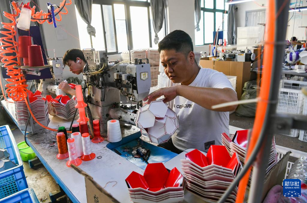9月15日,义乌一家体育用品公司的工人在赶制足球订单。