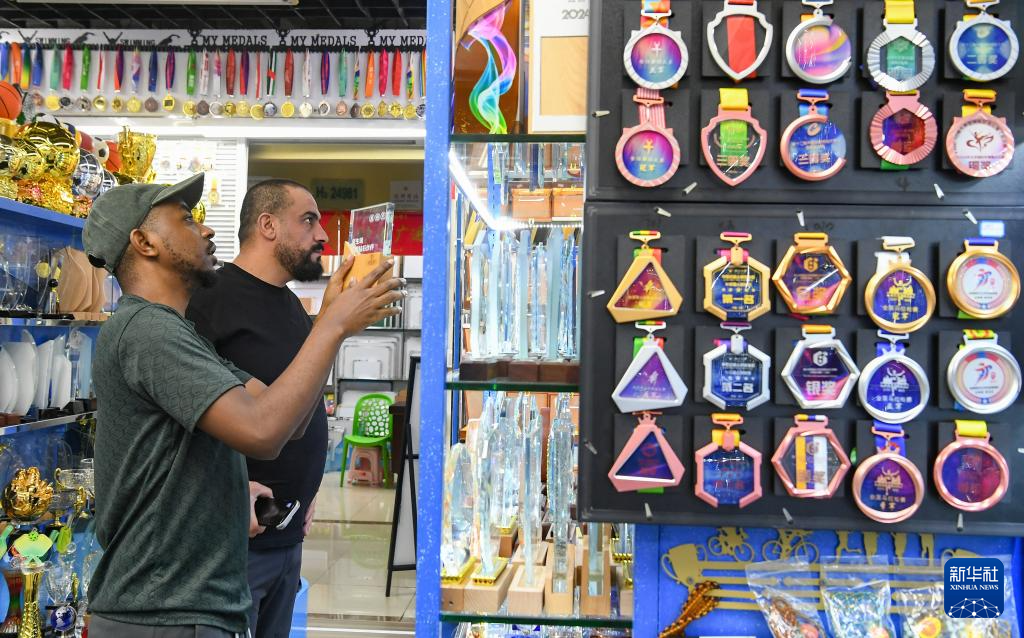 9月15日,外商在浙江省义乌国际商贸城三区商铺采购奖章、奖杯等体育用品。