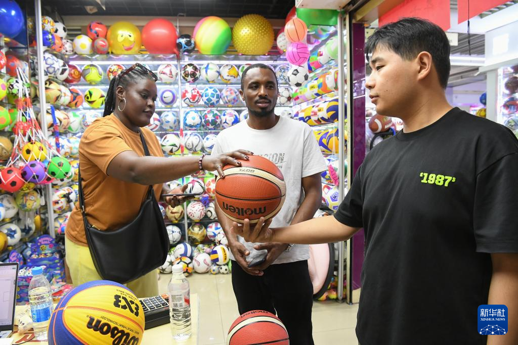 9月15日,外商在浙江省义乌国际商贸城三区商铺洽谈采购球类。