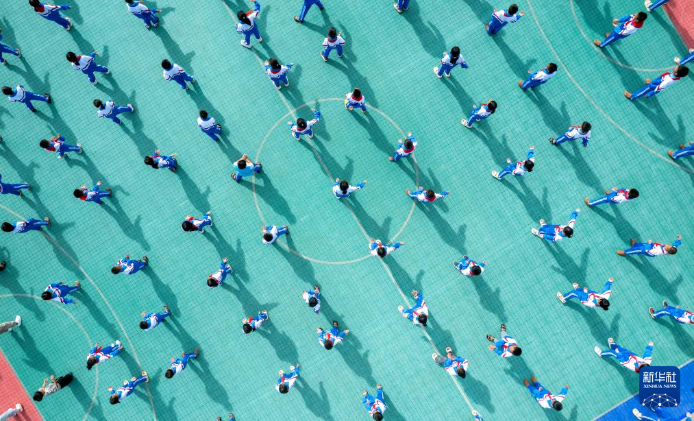 9月15日,腊福小学学生在操场做课间操(无人机照片)。