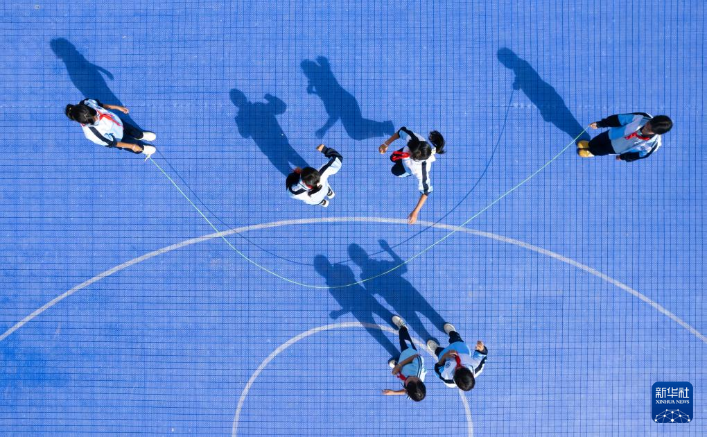 9月15日,戈的小学学生课间在操场跳绳(无人机照片)。