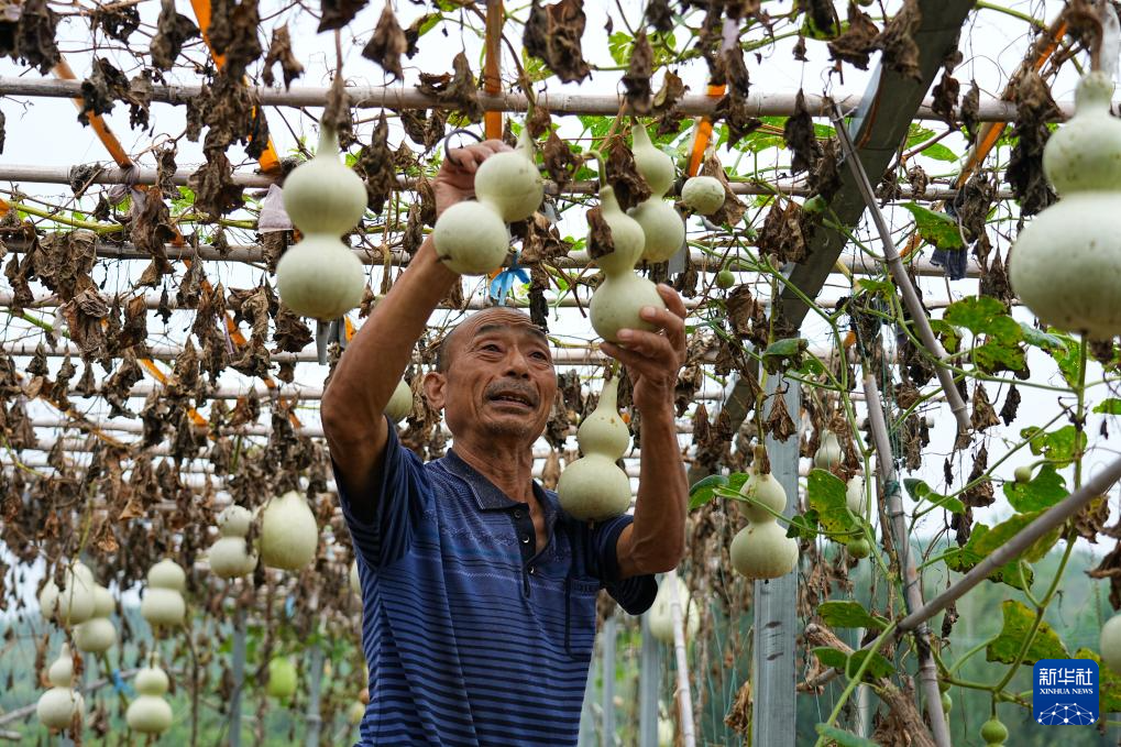 9月16日,村民在肥城市老城街道张家花峪村打理观赏葫芦。2022年,这个村创办肥城市七姑娘顶生态农业专业合作社,引导村民栽植葫芦3000余株,发展葫芦种植特色产业。