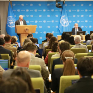 9月16日,在位于纽约的联合国总部,记者在联合国秘书长古特雷斯举行的新闻发布会上举手提问。