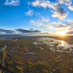 9月16日拍摄的额尔古纳湿地自然保护区日落景色(无人机全景照片)。