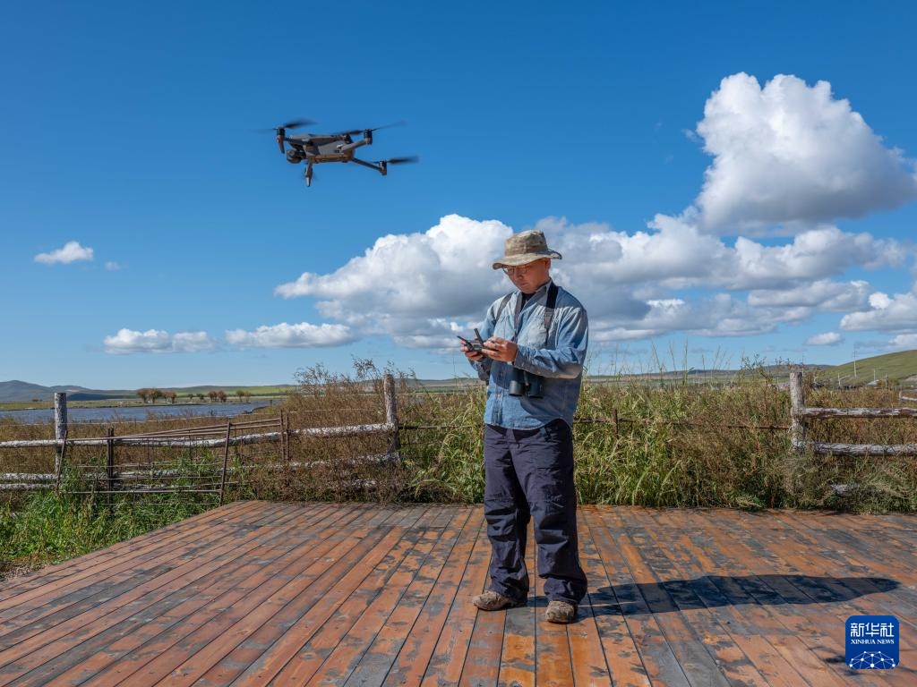 9月15日,宝金财在额尔古纳湿地自然保护区使用望远镜观测鸟类。