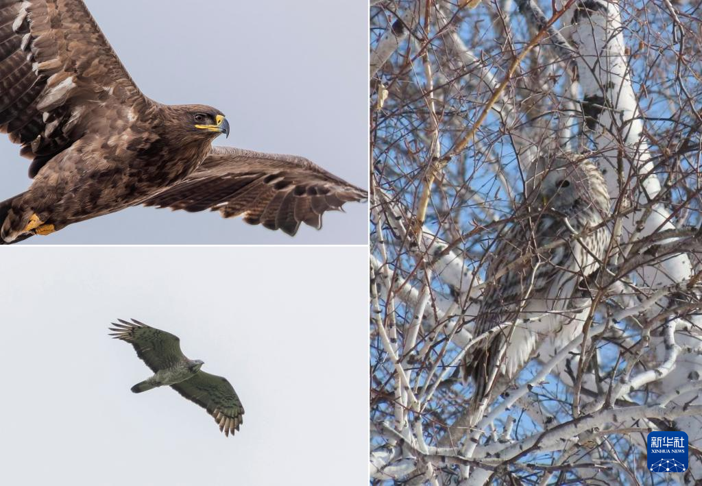 拼版照片:这是宝金财拍摄和记录的三个额尔古纳湿地自然保护区的鸟类新记录种(左上图为2025年9月5日拍摄的国家一级保护动物草原雕,左下图为2025年6月8日拍摄的国家二级保护动物凤头蜂鹰,右图为2025年3月5日拍摄的国家二级保护动物长尾林鸮)。
