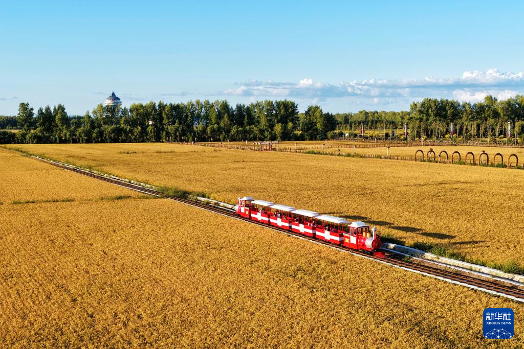 9月6日,在黑龙江省佳木斯市同江市,旅游小火车在稻田间行驶(无人机照片)。