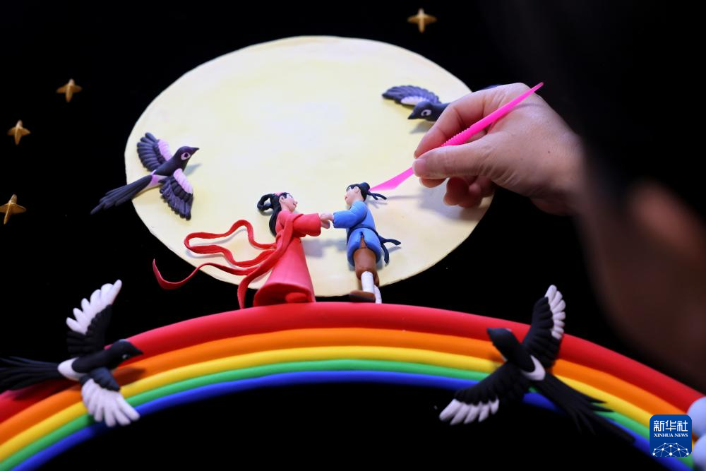 8月29日七夕节,在山东省枣庄市非物质文化遗产保护中心,民间艺人创作面塑作品《鹊桥会》。