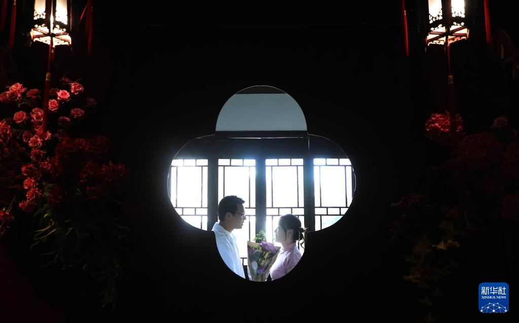 8月29日七夕节,一对新人在江苏省苏州市姑苏区婚姻登记处耦园登记点拍照留念。