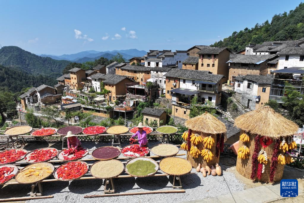 9月17日,在安徽省黄山市歙县深渡镇阳产村,农民趁晴好天气晾晒收获的农作物(无人机照片)。