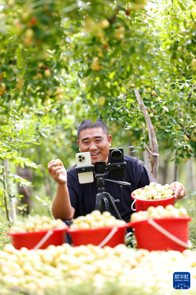 9月7日,在江苏省宿迁市泗洪县大楼街道面西社区的一处枣园,枣农通过网络直播推介当地的奶油沙枣。