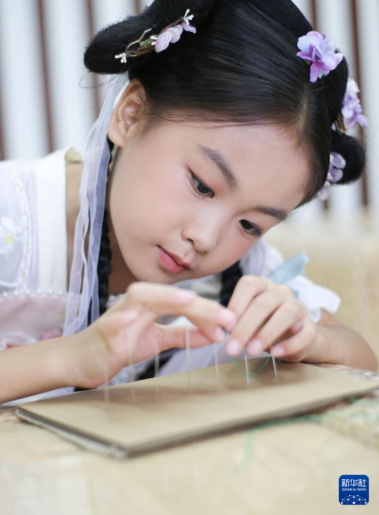 8月27日,在山东省邹平市黄山街道,小朋友在七夕民俗活动中穿针。