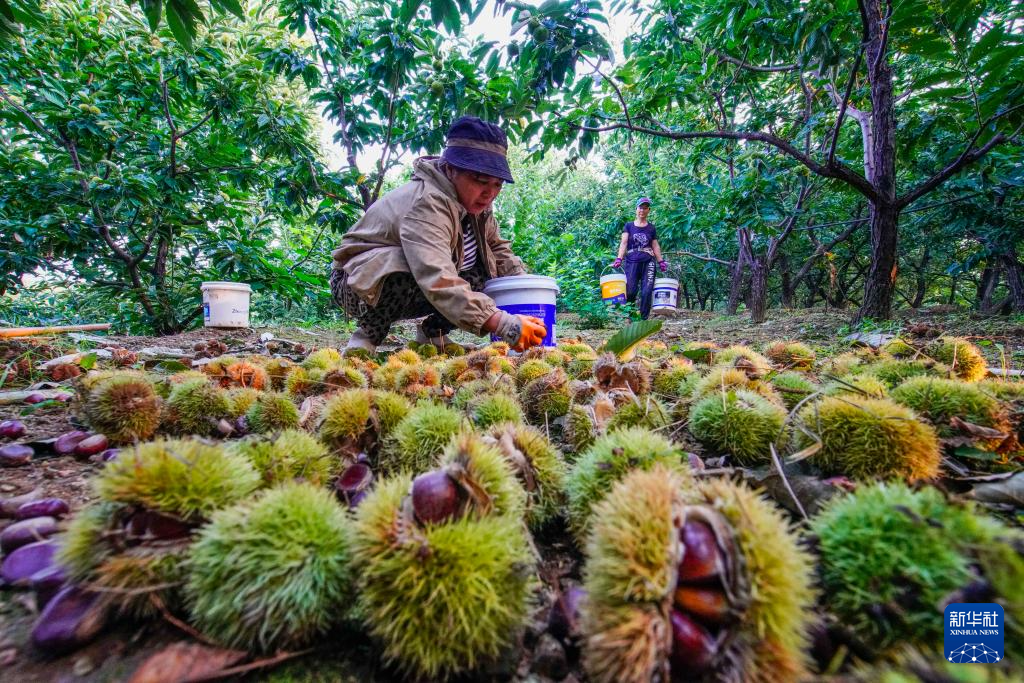 9月9日,河北省遵化市西三里镇北峪村农民在收获板栗。