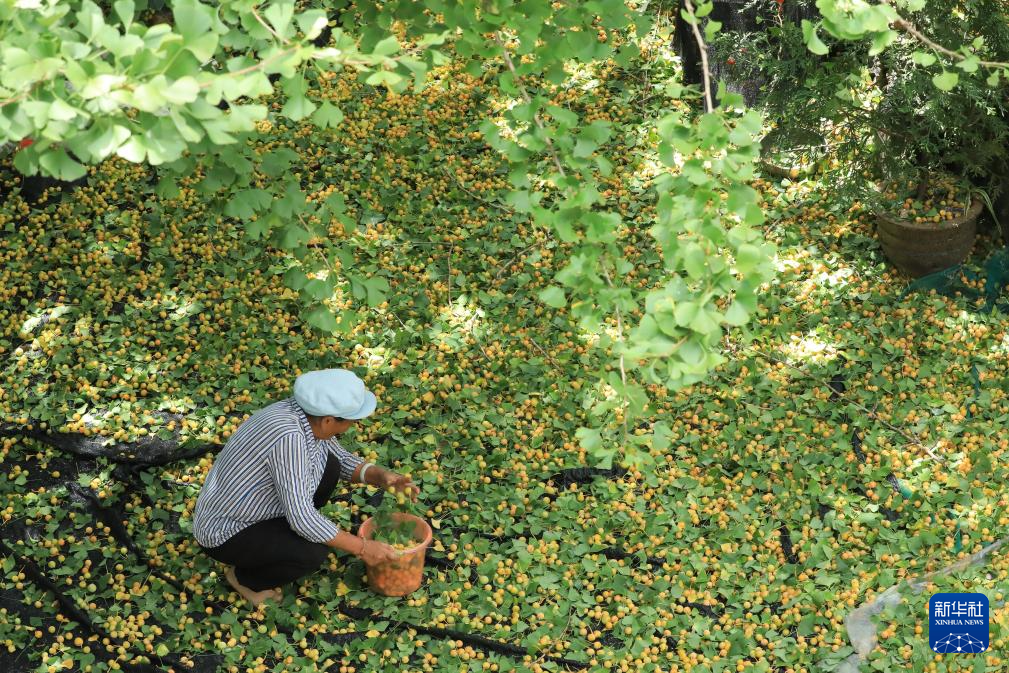 9月6日,农民在云南省腾冲市固东镇江东村收获落在地上的银杏果实。