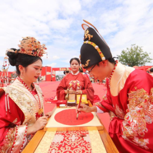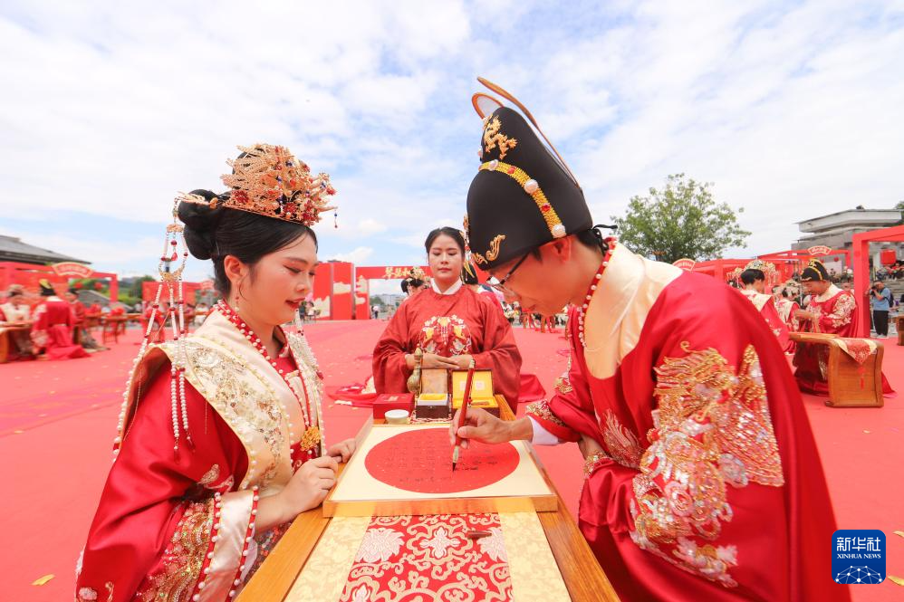 8月29日七夕节,在贵州省贵阳市花溪区贵阳孔学堂,新人在集体婚礼现场“共书婚贴”。