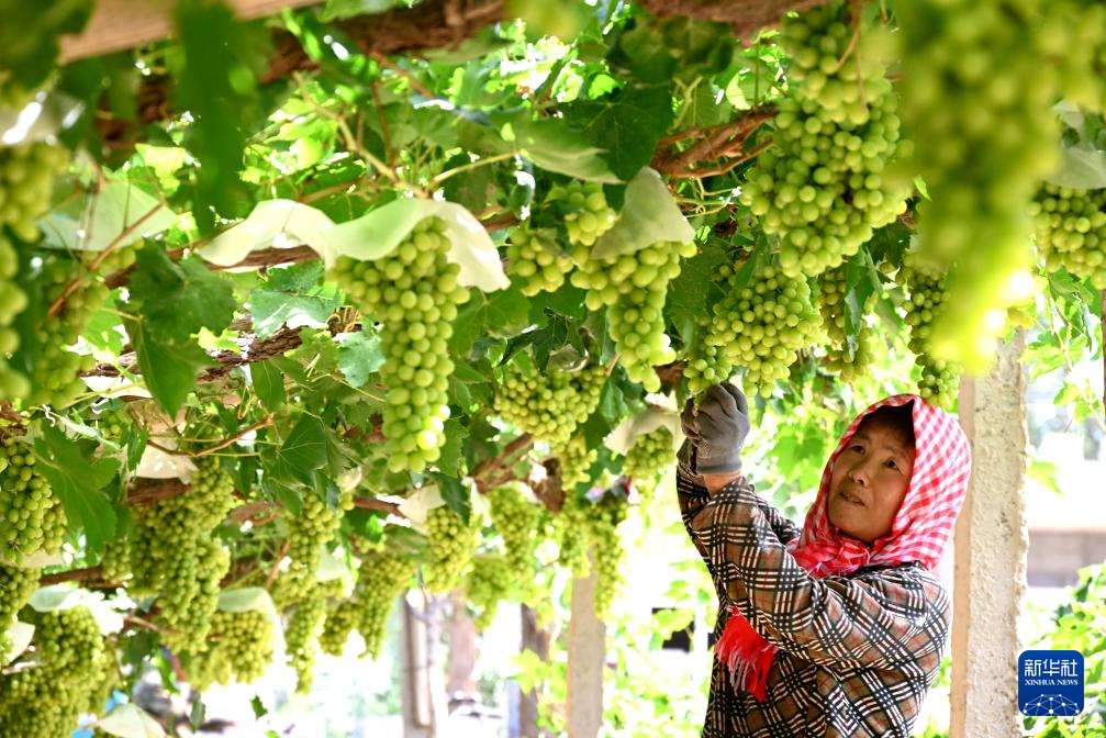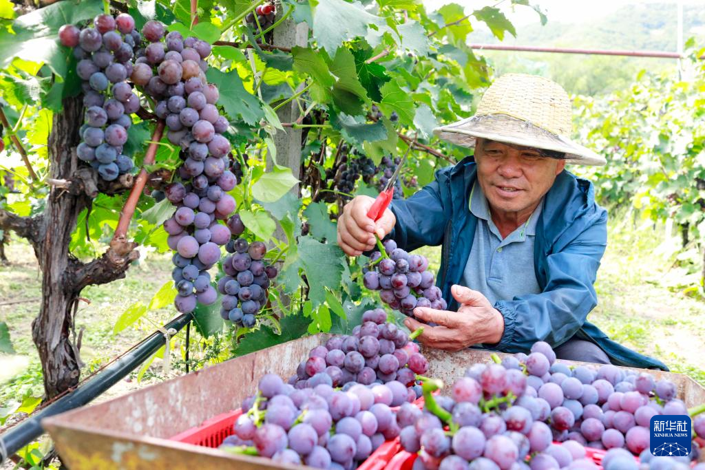 9月16日,在山东省威海市环翠区一处葡萄种植园,果农在采摘葡萄。