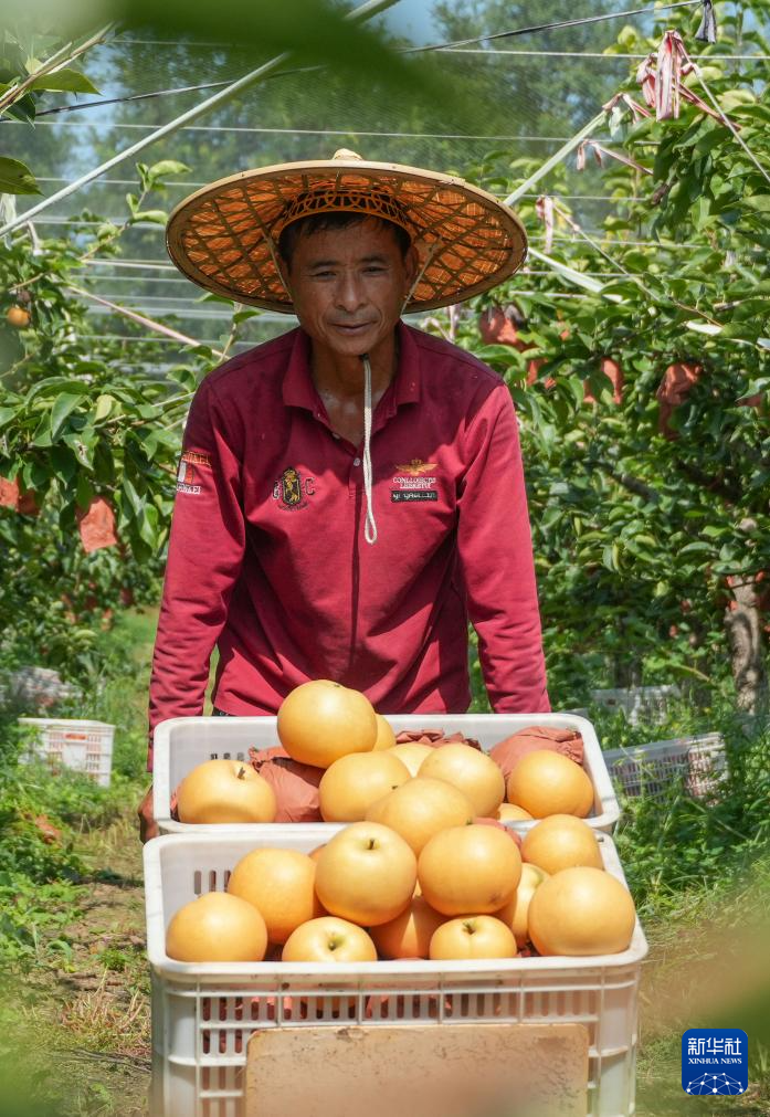 9月9日,在山东省邹平市台子镇一处梨园,果农搬运刚采摘的秋月梨。