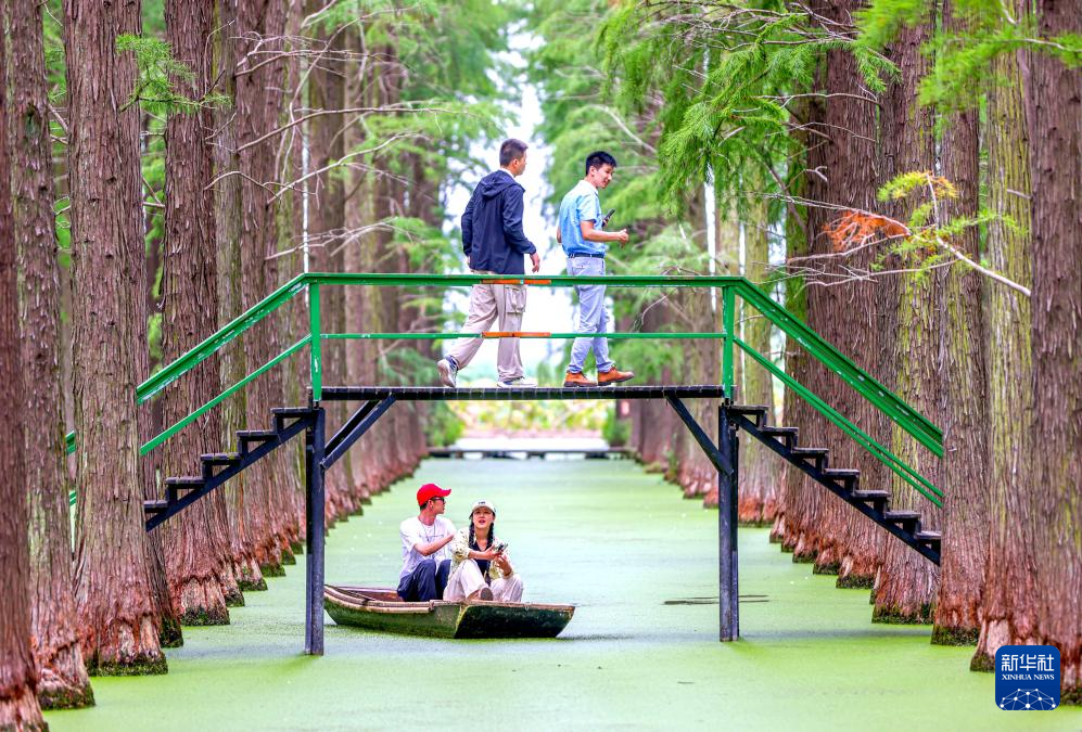 9月11日,游客在江苏省扬州市江都区渌洋湖湿地公园“水上森林”赏景游玩。